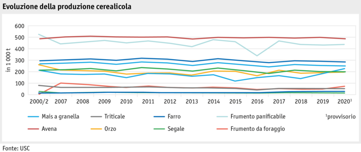 Nel 2020, grazie a maggiori superfici coltive e in parte a rese più elevate, la produzione di cereali da foraggio è stata più abbondante rispetto all’anno precedente. Per il foraggiamento degli animali da reddito erano disponibili 558 000 tonnellate di cereali, inclusi i cereali panificabili non idonei alla panificazione. A complemento dei sottoprodotti dell’industria alimentare, come polpa di barbabietole da zucchero, crusca di frumento, pannelli di colza e borlande, sono stati importati cereali da foraggio e prodotti campicoli proteici.
